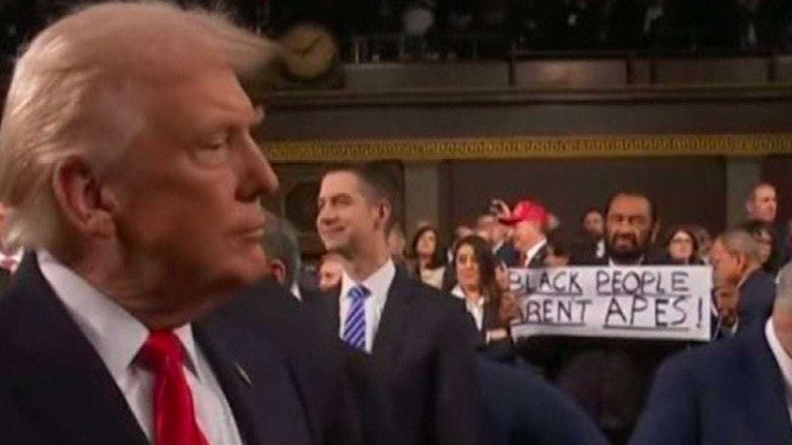 The sign referenced a video Trump posted on social media in early February depicting Barack and Michelle Obama, the former president and first lady, as apes. Politicians on both sides of the aisle called the video racist.